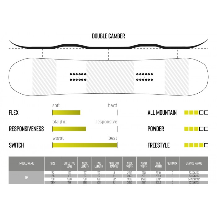 Izliekuma un šūpuļveida dizaina kombinācija, Double Camber dēļi apvieno priekšrocības, ko sniedz stabils kontakts ar izliekuma dēļu plēvēm un neticamu šūpuļu peldspēju un elastību vienā dizainā.